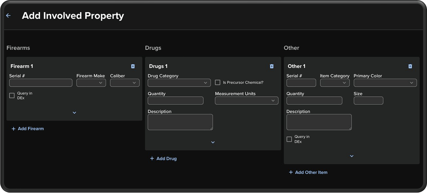Add firearms, drugs and other items to your CAD events directly from your MDT for capture, data collection, tracking and searchability.