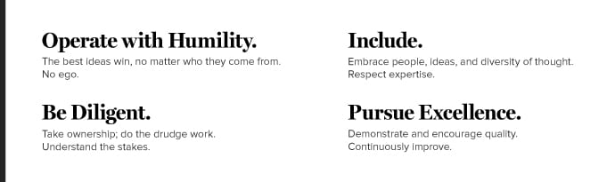By using our core values as a guide to review ourselves and each other, we are able to make performance growth plans that are directly tied to these values. We have also learned which core values we can improve on and which values are inspiring positive collaboration and hard work. After our most recent round of performance reviews earlier this year, we surveyed the team to get their opinions on how the process went. The survey revealed that our team overwhelmingly supported the use of our core values as a measurement for performance and success. For us, our core values aren’t just fluffy, feel-good phrases painted on our walls. They are the tangible beliefs we use to hold ourselves accountable to our clients and each other.
