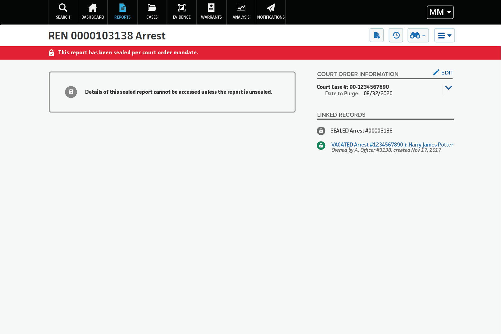 A sealed report in the Mark43 RMS showing report number, court number & other related details, purge date, and related records. Once sealed, the report cannot be accessed unless it is unsealed per a new court order.