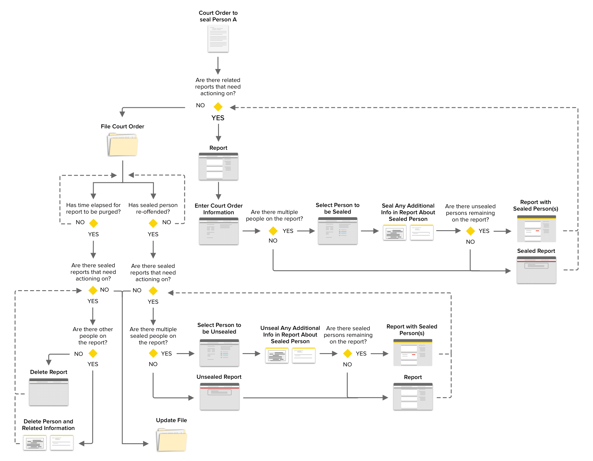 Creating a feature for acting on post-conviction relief processes began with learning how records admins currently act on court orders. We studied the laws and terminology used by state legislation and LEAs, and then proceeded to interview and shadow users from different police departments across the United States. Our findings revealed that these sealing processes are almost entirely paper-based. Users print out copies of the electronic reports, delete those reports from the RMS, fine-tooth comb through these documents with a sharpie to remove any reference to the person obtaining this post-conviction relief, and re-upload the redacted report into their system. Because of this, records departments keep a growing mass of physical records stored on site.