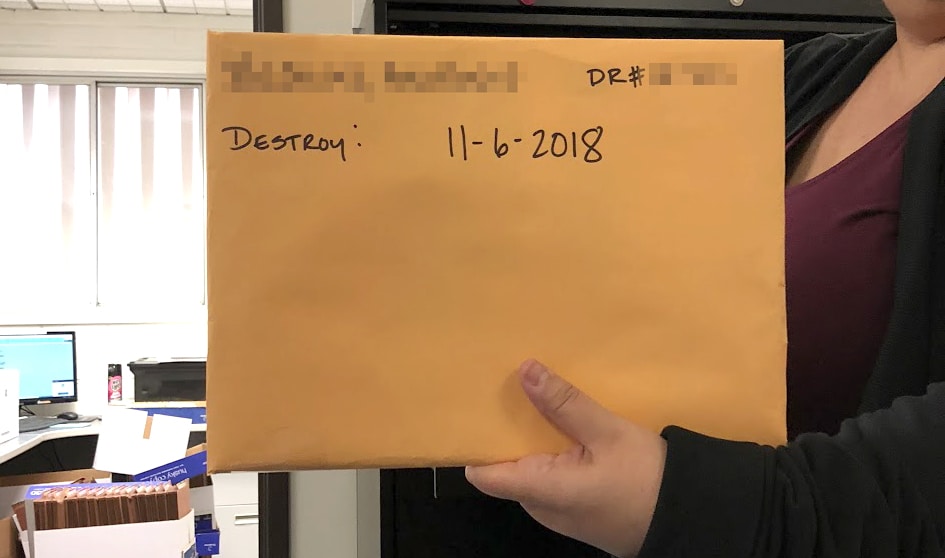 A typical ‘sealed report’ in an old workflow, which shows the involved person’s name, court order number, and purge date on an envelope with the full report inside.