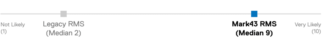 Department users overwhelmingly rated Mark43 RMS higher than their legacy system on system usability, performance, and effectiveness. When asked how likely they are to recommend Mark43 RMS to another officer on a 10 point scale, Mark43 scored a median 9 out of 10.